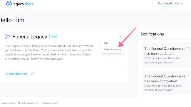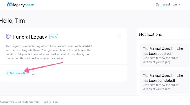 DashboardWhen you log into Legacy Share, you will be taken to the Dashboard. is You get the share link from your created Legacy.